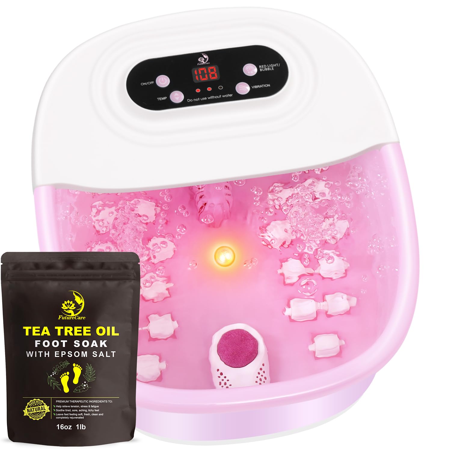 Foot Spa Bath Massager with Heat Bubbles and Vibration Massage and Jets, 16 OZ Tea Tree Oil Foot Soak Epsom Salt, Foot Soaker with Red Light, 22 Massage Rollers, Adjustable Temp - Pink